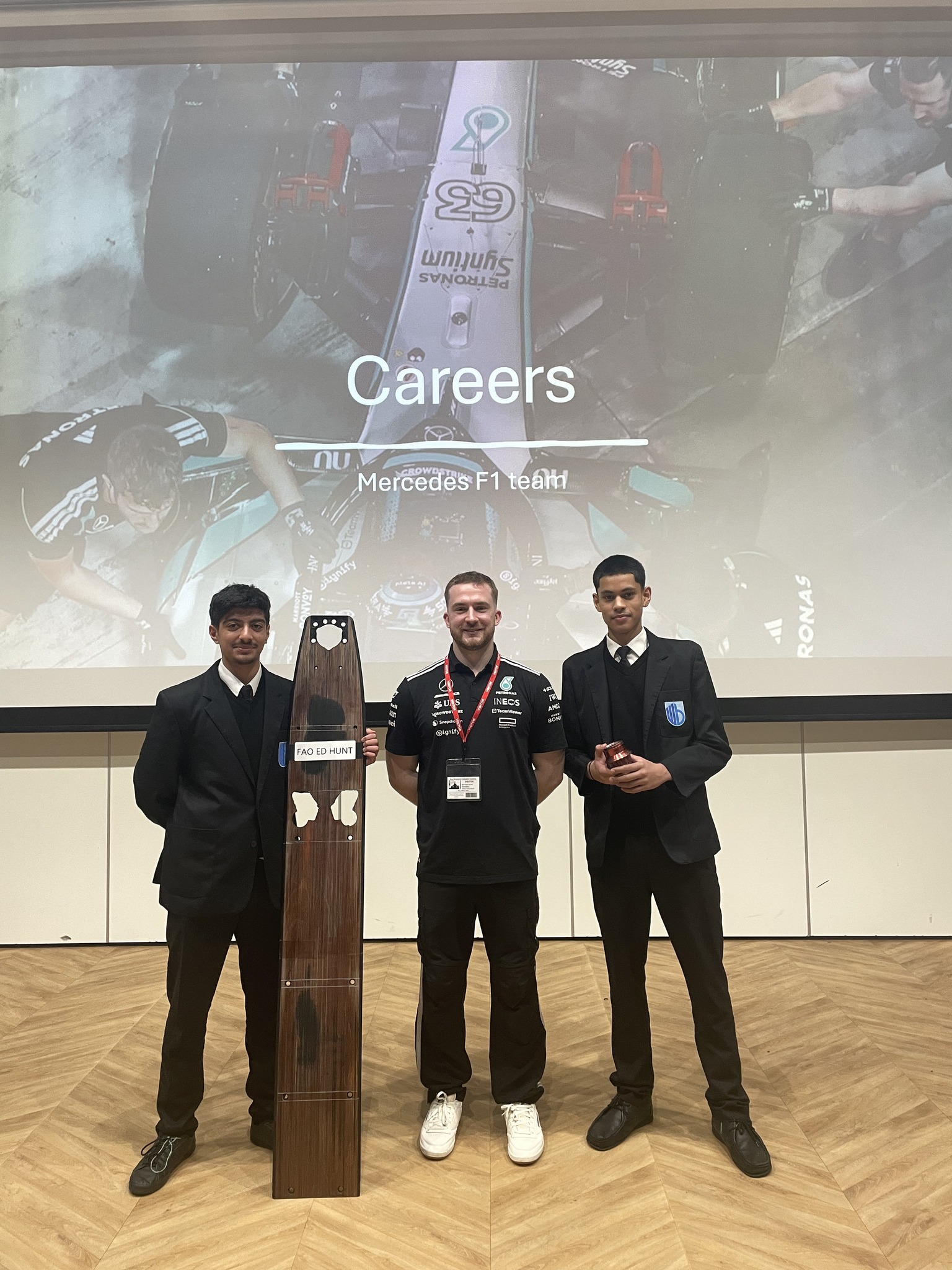 During the visit, students examined components from Formula One cars, including a skid block from George Russell’s winning vehicle and a wheel nut from Lewis Hamilton’s race car. The artefacts were used to demonstrate the precision engineering behind the sport.
